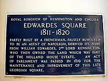 Lord Kensington married Dorothy Patricia Thomas, daughter of Richard Thomas, in 1797; they had six sons and two daughters. He died in August 1852, aged 75, and Edwardes Square, London W8 is named in his honour. He was succeeded in the barony by his son William. Another son, George Warren Edwardes (1802–1879), joined the army and then the colonial service. London and Edinburgh Gazette entries record his early career: he joined the 17th Dragoons as a Cornet by purchase in 1824, transferred to be a Cornet and Sub-Lieutenant in 2nd Life Guards in the same year, and had risen to captain in 32nd Foot by 1828. In 1836 he went on half-pay in the 14th Foot until transferring to the 72nd Foot in 1840. He was appointed Colonial Auditor at St Helena in 1845[4] and was still there whenhis father died.[5] In 1856 he became Governor of Labuan.[6] He was a "bitter enemy of the Brookes...deeply jealous of Sarawak" (the adjacent British-ruled, albeit independent, power).,[7] which led to his being relieved of his position as Consul-General to Brunei, and his Governorship terminated, in 1861 after he had incurred British government displeasure for his use of the HEIC steamer Victoria to travel to Muka and threaten to fire a broadside at Sarawak forces unless they ceased their activities against Sherip Masahor.[8] Never married,he died at Chandos House London on 21 February 1879[9] and was buried in Kent.[10]