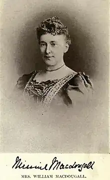 In November 1872, McDougall married his second wife, Mary Adelaide Beatty. She was the daughter of Eleanor and Dr. John Beatty, a professor in Victoria University. She was born and educated at Cobourg, Ontario. Mary was involved in various philanthropic organizations including the Ottawa Humane Society. The couple lived at 407 Wilbrod Street, Ottawa. The couple had three sons, two of whom served with the Canadian contingent during the Boer War in South Africa.[4]