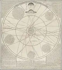 His lectures were often accompanied by publications. In 1712, he published, with John Senex, a chart of the Solar System showing numerous paths of comets.[37] In 1715, he lectured on the total solar eclipse of 3 May 1715 (which fell in April Old Style in England); Whiston lectured on it at the time, in Covent Garden, and later, as a natural event and as a portent.[38]