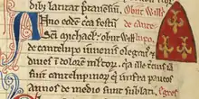 - ↑ They appear as a marginal drawing of an inverted shield referring to his "impious murder" (Nota impiam murthram). Historia Anglorum, Chronica Majora, Part III; (1250–59) British Library MS Royal 14 C VII f. 116 However Matthew Paris depicts different arms for him in his Chronica Majora, Part III, fol.75v, in an inverted shield: Gules, four piles meeting in base or (Lewis, Susanne, The Art of Matthew Paris in the Chronica Majora)