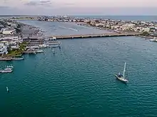 The construction and popularity of these new buildings were made possible in part by constructing a highway and car bridge to the beach in 1935. A causeway from the mainland to Harbor Island was built in 1926. This allowed people to drive to the first part of the beach. The opening of a road all the way from the mainland to the beach, with a bridge over Banks Channel, allowed residents and visitors to access the town via road easily. On April 18, 1939, W.R. "Tuck" Savage, who had operated the first electric streetcar in Wilmington, also piloted the city's last one on a return trip to Wrightsville Beach.[9]