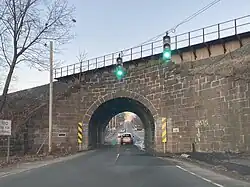 The Yalesville Underpass is a 30-degree skew arch bridge[1] carrying the railroad over Route 150 and Route 71 in Wallingford, Connecticut. Built in 1838 for the Hartford and New Haven Railroad by William MacKenzie, it is reported to be the first skew underpass in America.[2] The arch was designed to allowed tall hay wagons to pass through but it is not wide enough for modern two-way traffic, the one-way traffic being controlled by a pair of lights. Due to the age of the bridge, it has to undergo repairs on a regular basis.