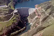 Construction of the Yellowtail Dam was authorized by the Flood Control Act on December 22, 1944 as part of the Pick-Sloan Plan, a water management scheme covering the entire upper Missouri River Basin in the north-central United States.[2][3] Three proposals were then made by the Reclamation Service, the predecessor of the present-day Bureau of Reclamation, during the first half of the century. The first idea called for the building of a 480-foot (150 m) arch gravity dam at the present-day site. The second suggested constructing a pair of smaller dams on the river about 70 miles (110 km) apart. Plans for the current dam were finalized in the 1950s, as a high dam would provide a greater hydraulic head, allowing water to be diverted into canals at higher elevations to serve farms both within and downstream of the Crow lands.[4]