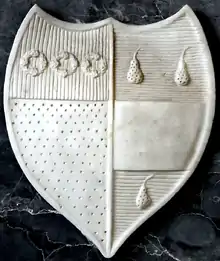 Escutcheon showing hatched arms of Morrison impaling Orchard. Detail from Charlotte Orchard's mural monument.[lower-alpha 2]