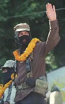 Since 1994, the group has been nominally at war with the Mexican state (although it may be described at this point as a frozen conflict).[9] The EZLN used a strategy of civil resistance. The Zapatistas' main body is made up of mostly rural indigenous people, but it includes some supporters in urban areas and internationally. The EZLN's main spokesperson is Subcomandante Insurgente Galeano, previously known as Subcomandante Marcos (a.k.a. Compañero Galeano and Delegate Zero in relation to "the Other Campaign"). Unlike other Zapatista spokespeople, Marcos is not an indigenous Maya.[10]