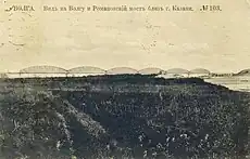 The village of Kabashchich was formed in 1865 on the site now occupied by modern Zelenodolsk. By 1890, 104 people lived in the village and sawmills began to operate nearby it. In 1897, the village was renamed as Paratsk or Paratsky Zaton, by which time it had become a place for repair and wintering of river ships sailing along the Volga. The backwaters of the shipyards would serve as the basis for the future factory named after Maxim Gorky. In 1928, Paratsk was reorganized into the working village of Zeleny Dol. On July 11, 1913, a railway bridge across the Volga was opened near the village, and a stations along this line was established in the village. In 1932, according to the Resolution of the All-Russian Central Executive Committee, Zeleny Dol received the status of a city and the name Zelenodolsk. In the period 1931-1932 three factories were built in the city and the area of housing increased by 24,000 m². Zelenodolsk was part of the Yudinsky region (Tat. Юдино районы) that was formed on August 4, 1938 from the western part of the abolished Kazan region. The administrative center of the district was located in the working village of Yudino (now part of Kazan).[12][7][8][13]