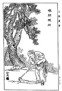 Zhou Fang and Tao Kan were the subjects of two anecdotes highlighting their friendship and foreshadowing their eventual fates. The first anecdote regards Tao Kan, whose father had died while he was still of low status. While preparing his father's burial, his cow had also disappeared from his home. When he went out to search for it, an elderly man appeared and said to him, "I saw a cow laying in a ditch below the mountain up ahead. If you hold a burial there, you will achieve a high position as a subject." He then pointed to another mountain and said, "That one is also good. Bury someone there, and you will be an official with a salary-rank of 2,000-dan." After he finished speaking, the man disappeared. Tao Kan found his cow and buried his father at the place that it was at. He then told Zhou Fang about the other mountain. When Zhou Fang's father died, he buried the body at the indicated location. As predicted, Tao Kan achieved great success, and Zhou Fang obtained a high salary.[21]