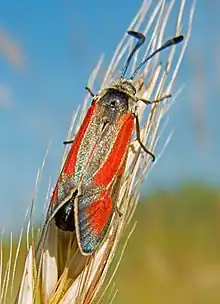 Z. punctum O. Represents the preceding African insect [ Zygaena favonia Frr.] in the South of Europe. Position of the red spots as in Zygaena sarpedon, but the apical spot enlarged, appearing washed out, being deeper red centrally and pale at the edges. Red abdominal belt always absent. Name-typical punctum occurs at the north-east coasts of the Mediterranean Sea, as far as Armenia; small, the markings of forewing more or less confluent, the hindmargin remaining broadly black. — In dystrepta Fisch.-Wald. [ now Zygaena punctum dystrepta Fischer de Waldheim, 1832], from S. E. Europe and Asia Minor, the hindmargin is only very narrowly shaded with black, the forewing being otherwise all blood-red except distal margin; this colour replaced by miniate [red lead or vermilion] in a specimen from Asia Minor received from Messrs. Staudinger and Bang-Haas under the name of malatinaitalica Stgr.-Reb. [italica Stgr.-Reb. now a synonym of punctum] is a more densely scaled and therefore brighter coloured form from South and Central Italy, the apical patch being distinctly separated from the basal area by a narrow black interspace, while in the much larger contamineoides Stgr. (= contaminei Zell, dalmatina H.-Sch.) [ now Z. punctum ssp. ledereri Rambur, 1858 ], from Spain, Italy, and Sicily, a broad interspace isolates the apical spot completely. — Larva greenish, with white dorsal line and subdorsal rows of black dots, below which there are larger yellow spots. Head and thoracical legs black, abdominal legs yellow; in May and June on Eryngium. The imago in July at very limited localities, but rather common, flying low.[2] The wingspan is 25–30 mm.